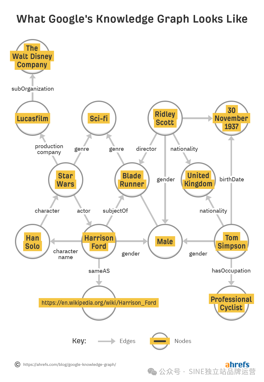 上图是来源于Ahrefs的一张Google知识图谱解释图,知识图谱像一张巨大的网,实体是网上的节点,关系是连接节点的线。像这样存储真实世界的数据有助于Google理解搜索查询背后的含义,能够为搜索用户提供更相关的结果。