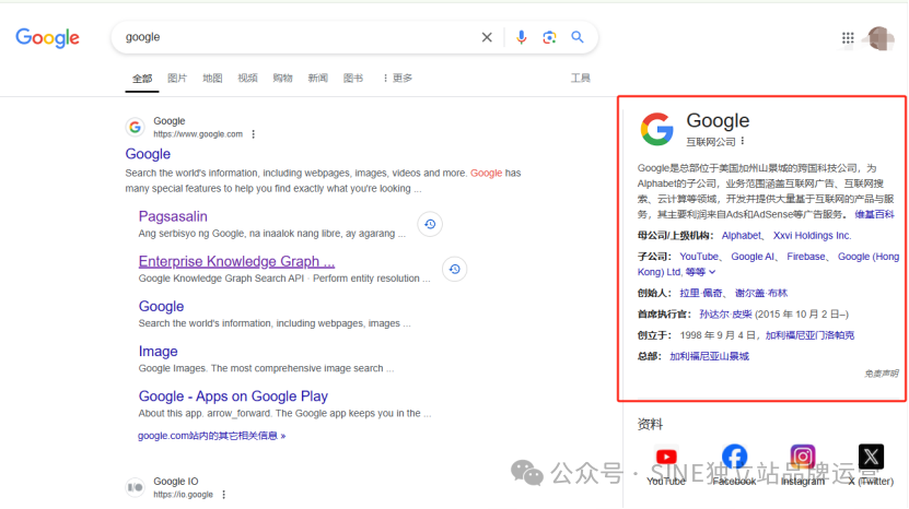 直接在Google搜索框中输入品牌名称或者产品服务名称,查看SERP中是否在顶部或者右侧出现知识面板,检查信息是否准确、完整,是否与网站信息一致。