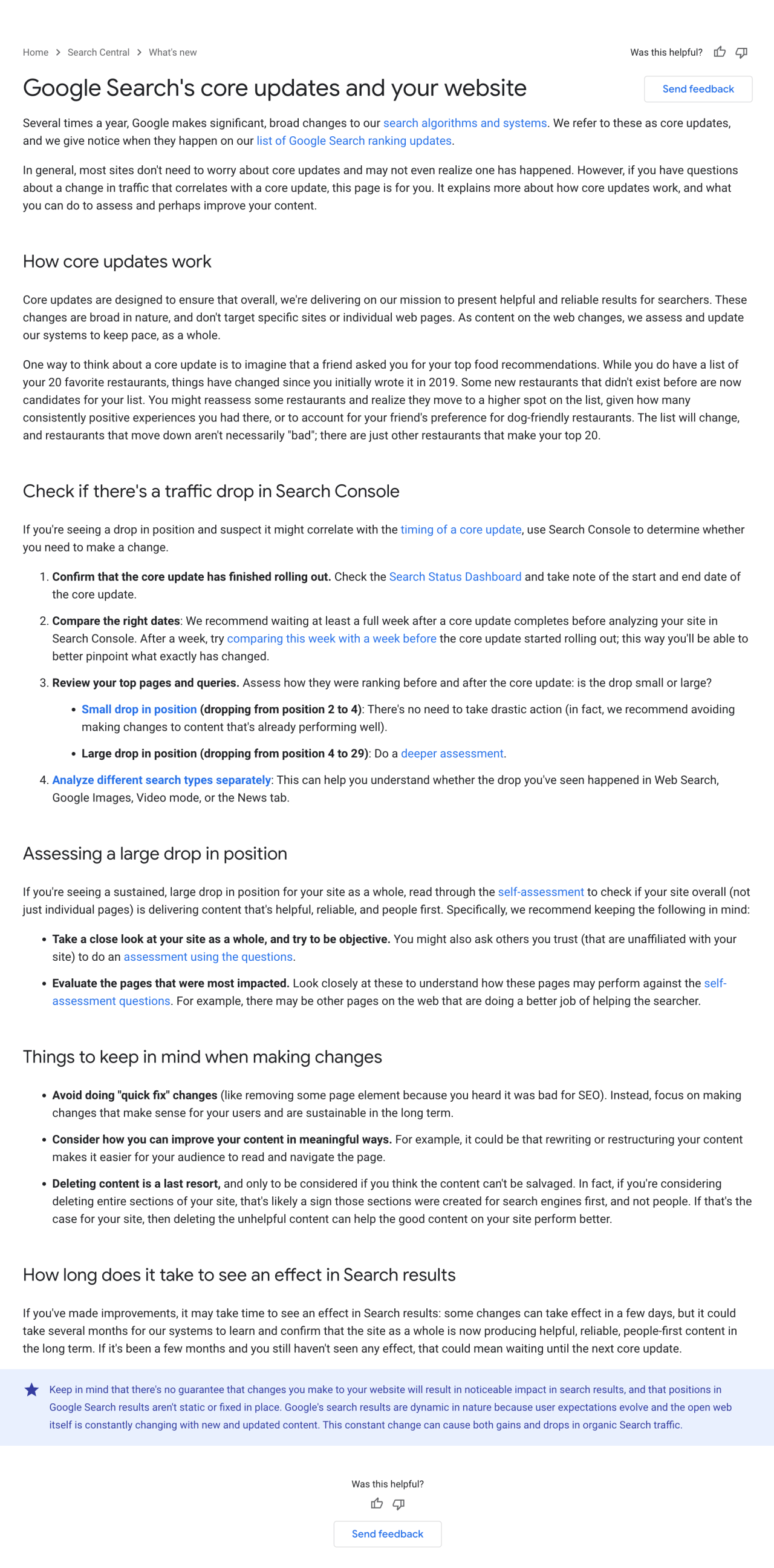 在8月15日的版本,除了在表述上的优化之外,内容也丰富了很多,新增了【Check if there’s a traffic drop in Search Console】和【Things to keep in mind when making changes】两部分,都是比较具体的指引,清晰地告诉大家在算法更新之后应该如何行动。 比如,在算法更新出现后,建议先别着急,在核心更新完成后,再用GSC对比网站在算法更新开始前一周的数据(我们也经历过在算法更新过程中是涨了但结束后又掉回去的情况)。 另外,应尽量规避诸如修改页面标签、元素、替换部分关键词等某几个很小的单一要素的优化。要改就整体进行修改,坚持以用户为中心的原则,思考如何给用户提供更有意义的内容,对网站整体的内容质量、用户体验开展长期的优化工作,例如像优化或重写内容、提升页面阅读的友好度等。如果网站存在大量目的是操纵搜索引擎排名的内容,实在来不及全部优化的话,可以采取先删除,之后再重新补上去的方式,不让这些低质量的内容影响网站整体的表现。 最后,就是我们比较关心的,我们优化完内容之后多久才能见效的问题。在最新的版本里面,谷歌终于不再像以前那样笼统地说需要一段时间了,明确写到如果你进行了优化,系统可能需要几个月的时间才能了解并确认整个网站现在正在长期提供有用、可靠、以人为本的内容。如果已经过了几个月还没看到任何效果,那可能意味着要等到下一次核心更新。 离本次算法更新结束还有一个月的时间,大家就先关注下近期的网站流量情况先吧。