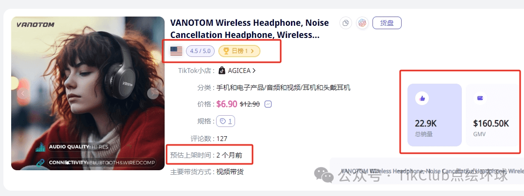 截止于2024年8月12日数据,AGICEA小店的VANOTOM 无线耳机,连续三天日均售出5500+单,登上了TikTok美区热销榜第一。