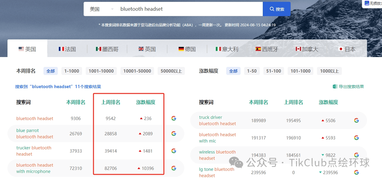 bluetooth headset相关词的搜索,在亚马逊排名是整体上升的!由此可见无线蓝牙耳机的热度。