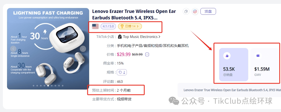 排行榜14的IPX5防水的联想蓝牙耳机,其最高日销7300单,目前已收获了159万美金GMV。