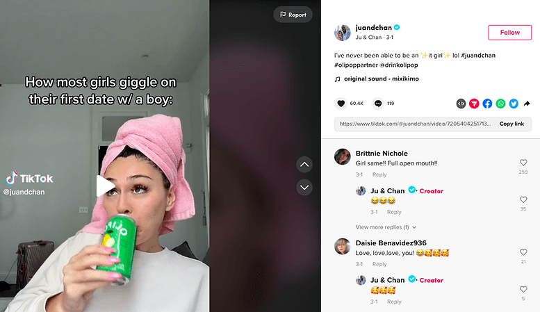 如果你在TikTok上搜索#OlipopPartner词条,你会看到出现的数百个相关视频。这是 @juandchan 的一个视频例子,他在搞笑内容的视频中喝 Olipop: