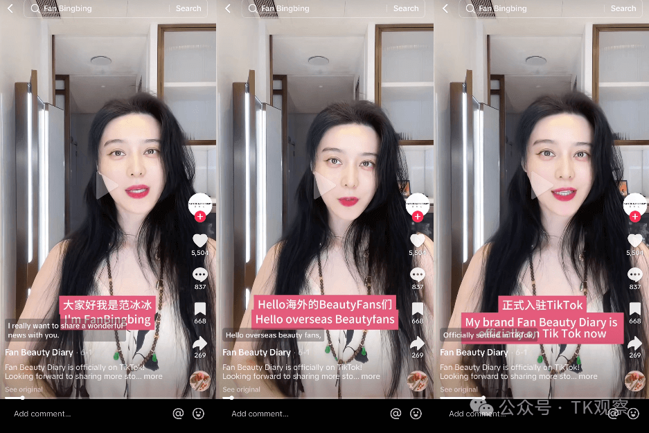 然而,作为一个国内知名公众人物,这个数据表现并不算特别突出,或许是和大部分达人“先攒粉丝再带货”的初衷类似,Fan Beauty Diary并没有着急开通“电商权限”进行带货,而是继续选择发布和范冰冰有关的一些视频,以此来希望积累一些TikTok粉丝。