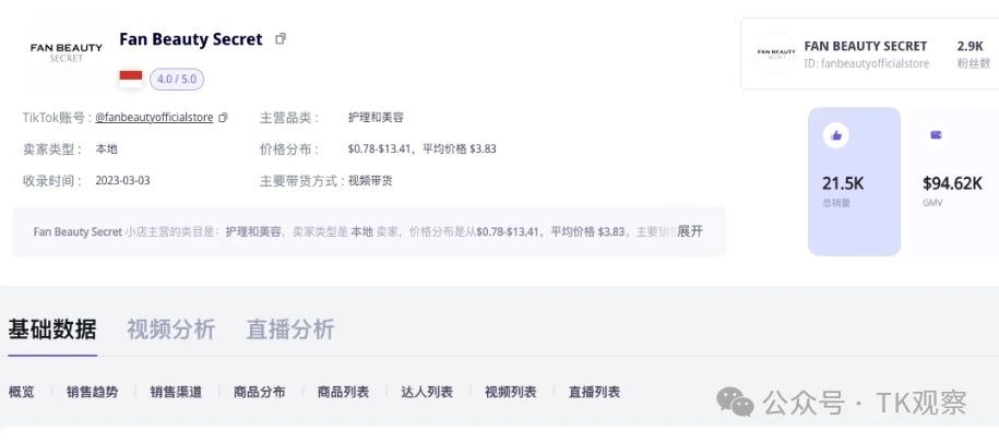 那我们回到Fan Beauty品牌在TikTok的销售额,看看卖了多少呢?由于Fan Beauty Diary我们在第三方数据平台暂未搜到其店铺,但是我们搜索到,Fan Beauty Secret(经查询也是Fan的自有品牌),在TikTok印尼站点,是有销量记录的。我们直接看下结果: