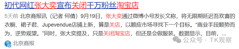 同样,最近还比较火的话题,张大奕关掉了经营了十年的淘宝店,那个店铺名字不好记,我前几天还看过这个新闻,这会儿又上网上查了查,叫“吾欢喜”。是一家做女装的店铺,具体的关店原因没有公开,我们猜测和女装的高退货率、市场竞争、开款上新成本高、库存压力、以及品牌认可度等都存在关系。