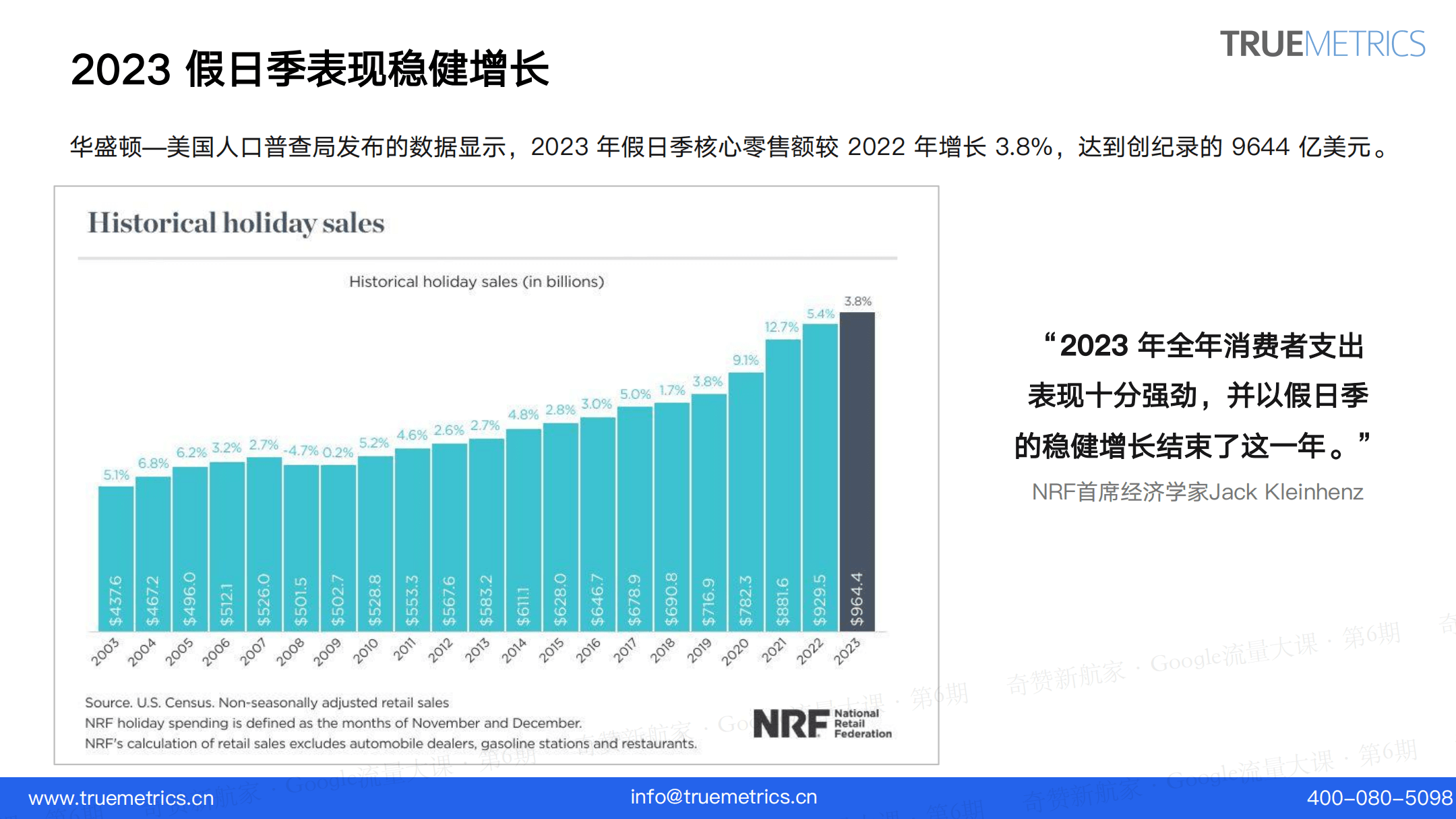 基于NRF的统计,我们会发现一件事情,尽管2023年所有的在holiday sales增速放缓了,只有增长3.8%。从这张图说明了一件事情,如果你是做出海的话,接下来的购物季,11、12月份,海外接下来黑五结束之后就是圣诞节,在这个过程中,你可能是更要发力的阶段。这个阶段我们需要解决这么几件事。