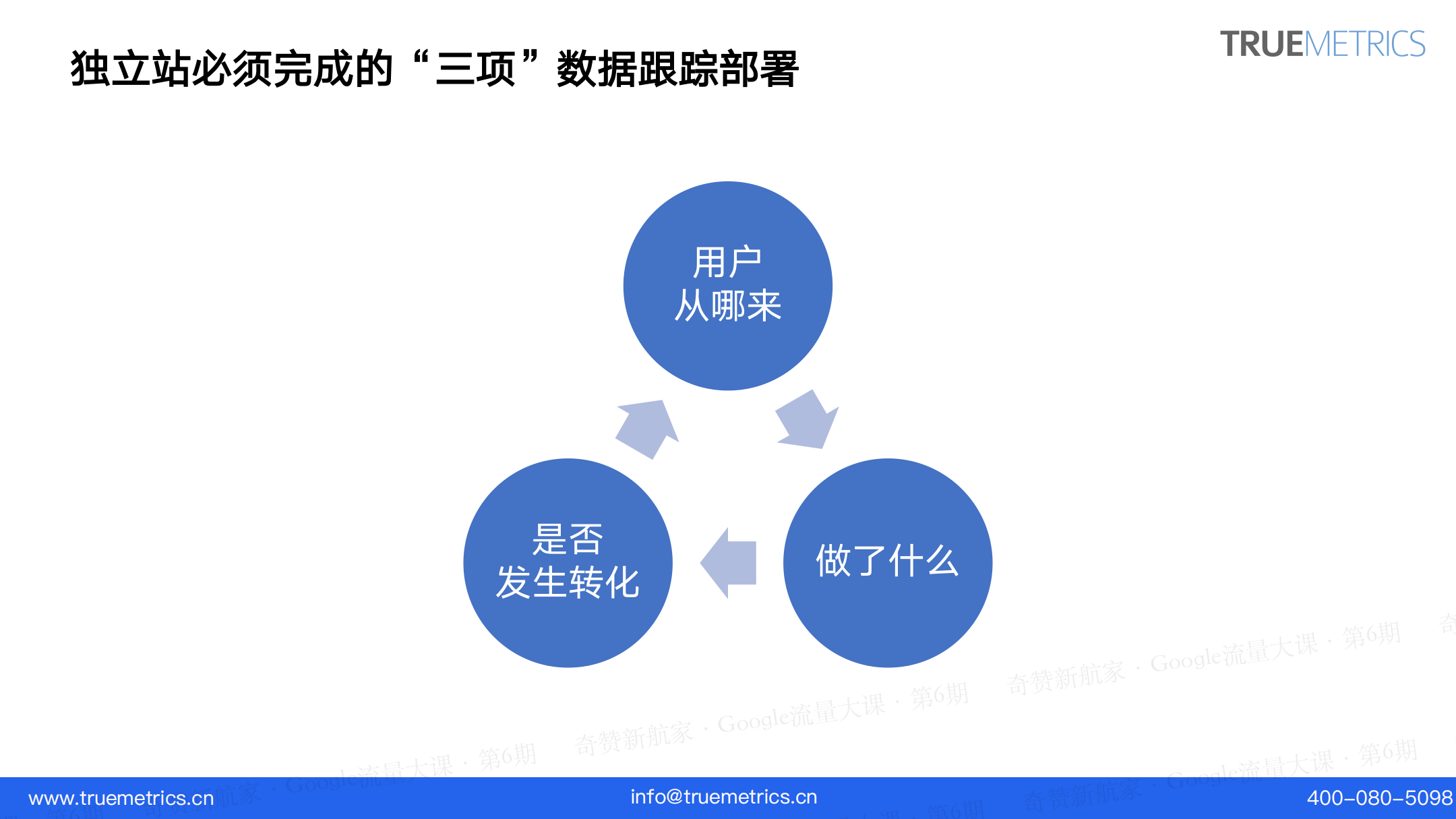 同样的,像标题的说明一样,我们在之前黑五之前就要完成三件事,用户从哪儿来,做了什么,是否发生转化,首先清晰地知道你的钱花在哪里,我建议大家至少要做track。第二步解决的是用户来到你的独立站上到底看了什么,如果你的产品品类还有很多的情况下,你更需要知道大家都听过啤酒和尿不湿的故事,大家要理解用户看了你的A之后有没有看你的B,你理解你的用户看了A对B感兴趣,但实际上用户对D感兴趣。最后是否发生转化了非常重要,这决定了你实际站外的投放和运营是否有效。