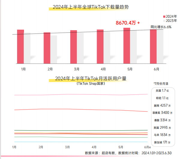 2024年上半年,TikTok全球月均下载量达到8173万次,同比去年上升6.6%。