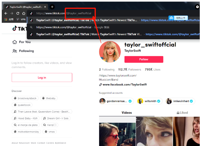 搜索账号:直接在搜索框输入www.tiktok.com/@某账号,如www.tiktok.com/@taylor_swiftoffcial,即可直达你关注的明星或达人主页。