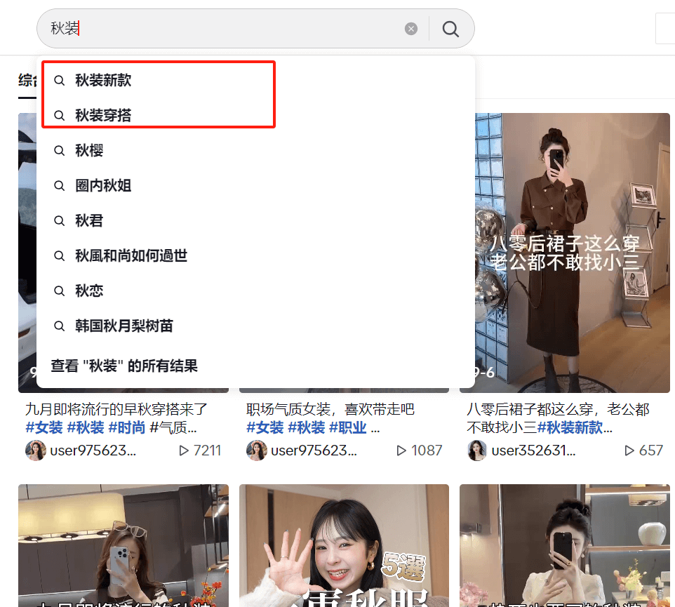 例如,搜索“秋装”这一关键词,创作者可以看到与之相关的热门内容,首先可以根据搜索下拉框选取适合的关键词,并创作出满足这些搜索需求的视频。