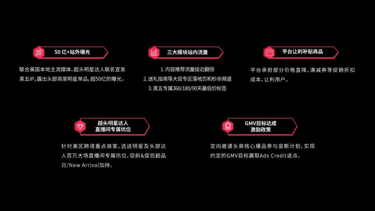 如今,一年一度的黄金节点又将到来,此时的 TikTok Shop 自然更是不敢松懈,不仅早早发布《全托管黑五大促官方备战指南》,督促商家尽快布局,更是联合美国本地主流媒体,超头明星达人进行宣发,推出 50 亿+站外曝光、三大模块站内流量、平台让利补贴商品、超头明星达人直播间专属坑位、GMV 目标达成激励政策五大重磅权益,刺激商家经营积极性。