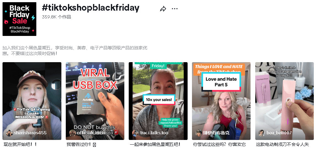 平台上带有“#tiktokshopblackfriday”标签的视频数量和浏览量的激增,也在无形间将这股消费热潮逐渐推向最高峰,浓厚的欢乐氛围为今年黑五的盛大规模提前造势,激发了大家对黑五大促的期待和参与意愿。