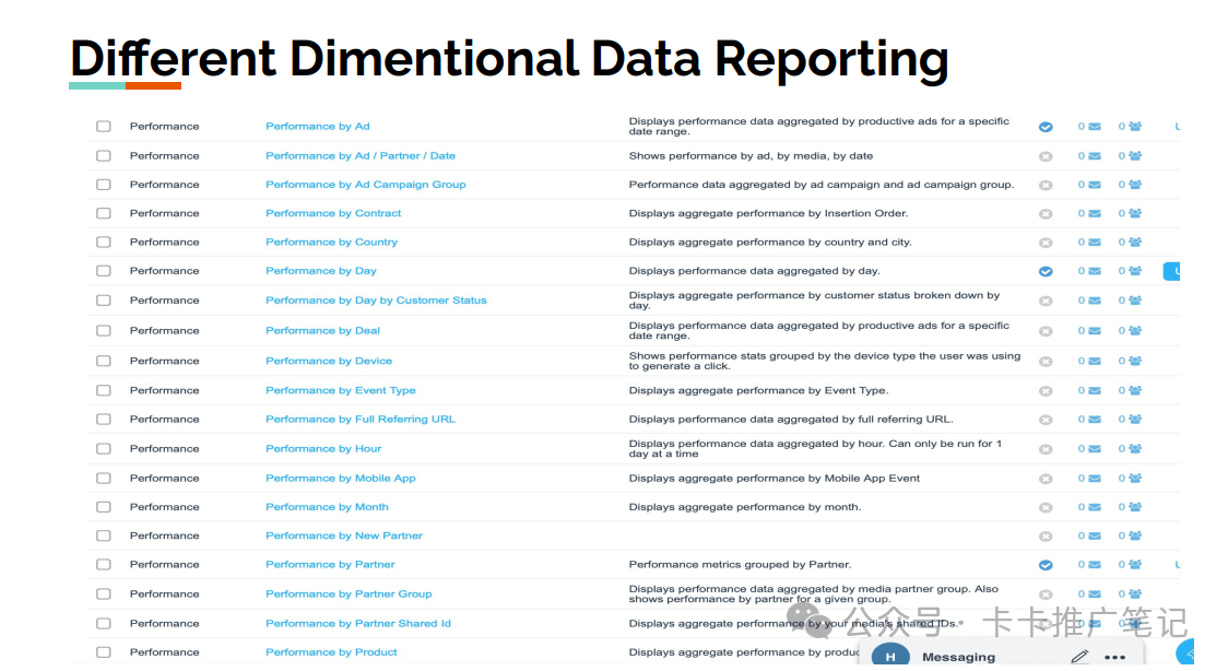 - 报表:可视化联盟客的推广效果,可以按照performance by day/week/month/publisher等。