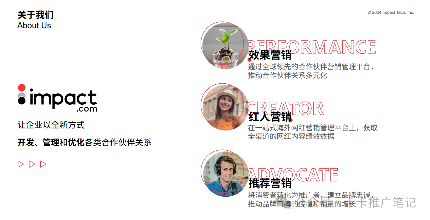 简介:impact.com 2008年成立于美国加州,先后收购了Activate(红人营销),Affluent(联盟营销提供分析和自动化工具),Trackonomics(全渠道收入归因),Pressboard(专门从事品牌内容的分析和报告平台),SaaSquatch(客户推荐软件提供商),是一个全面的合作伙伴关系管理平台,可促进联盟营销、KOL和推荐营销。它旨在简化管理各种类型合作伙伴关系的流程,为品牌提供有效招募、跟踪和优化合作伙伴关系的工具。2019年进入中国市场,办公地点在上海。