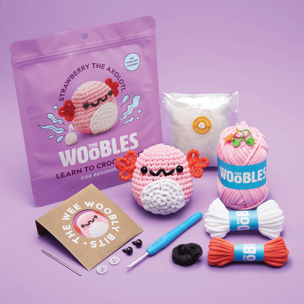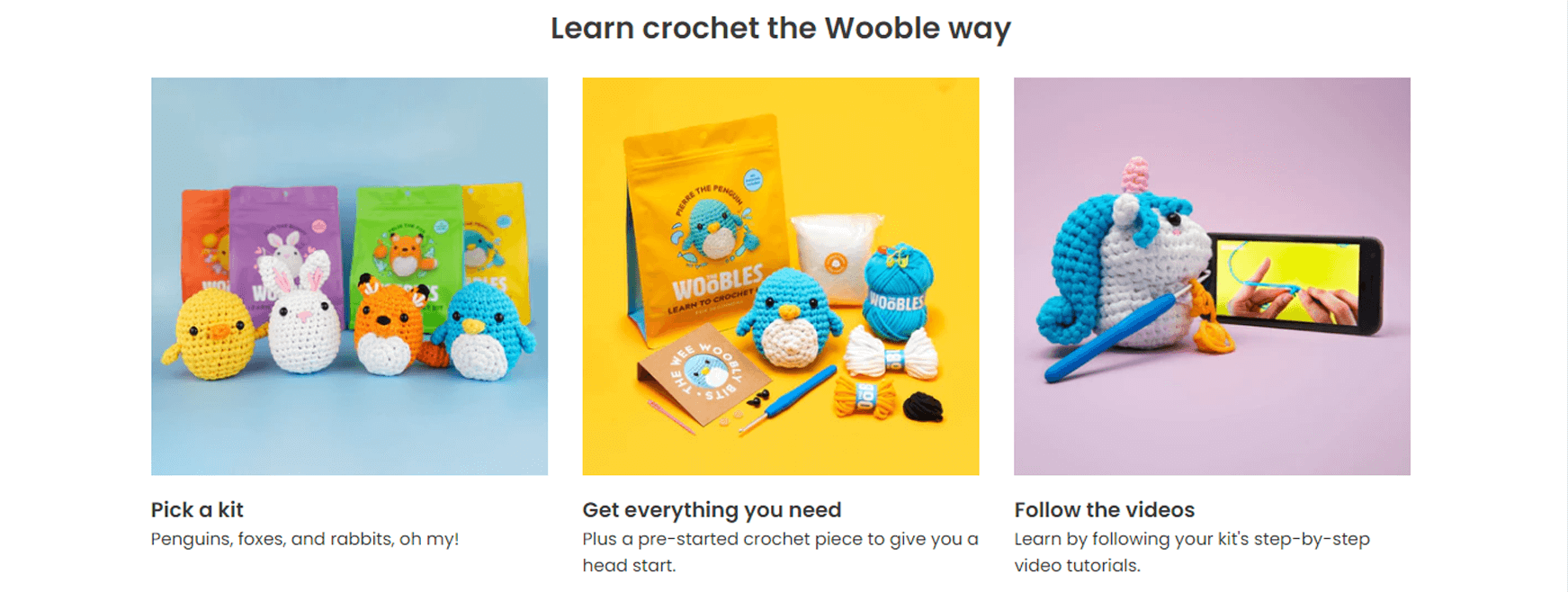 The Woobles的DIY钩针动物套件专为初学者设计,每个套件都配有“Easy Peasy”纱线、钩针、填充物、眼睛、教学教程、电子邮件咨询等,帮助消费者制作可爱的动物。