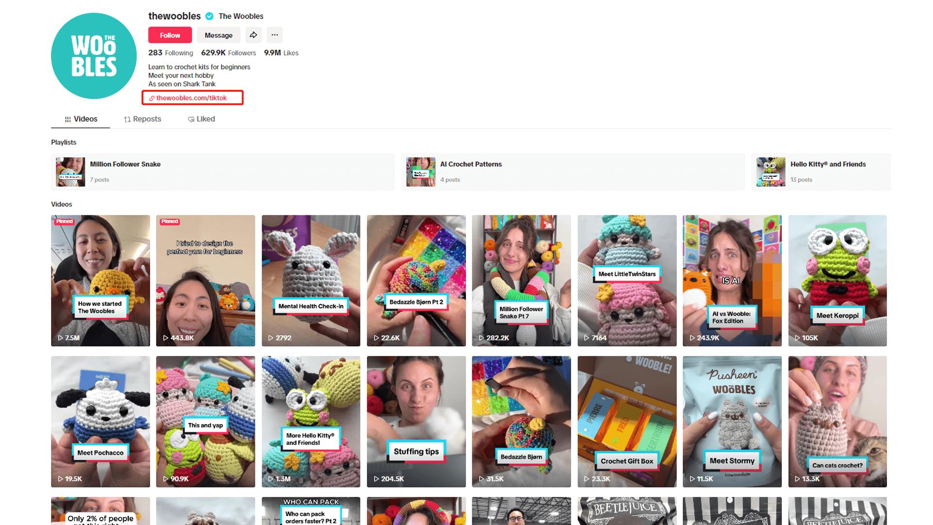 早在2022年4月,The Woobles就已经入驻TikTok,目前The Woobles在TikTok上收获有62.9万的订阅,总视频点赞量也达到百万级别,The Woobles还利用TikTok为品牌的独立站进行引流,实现了TikTok Shop之外的完整销售闭环。