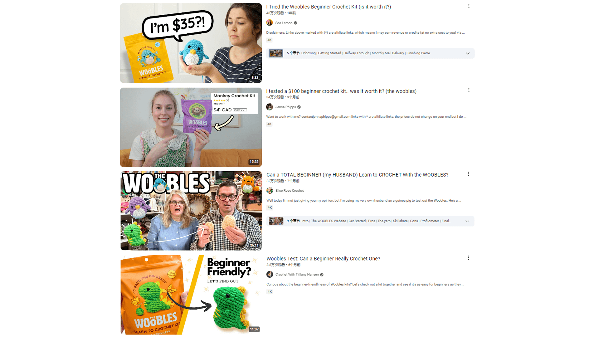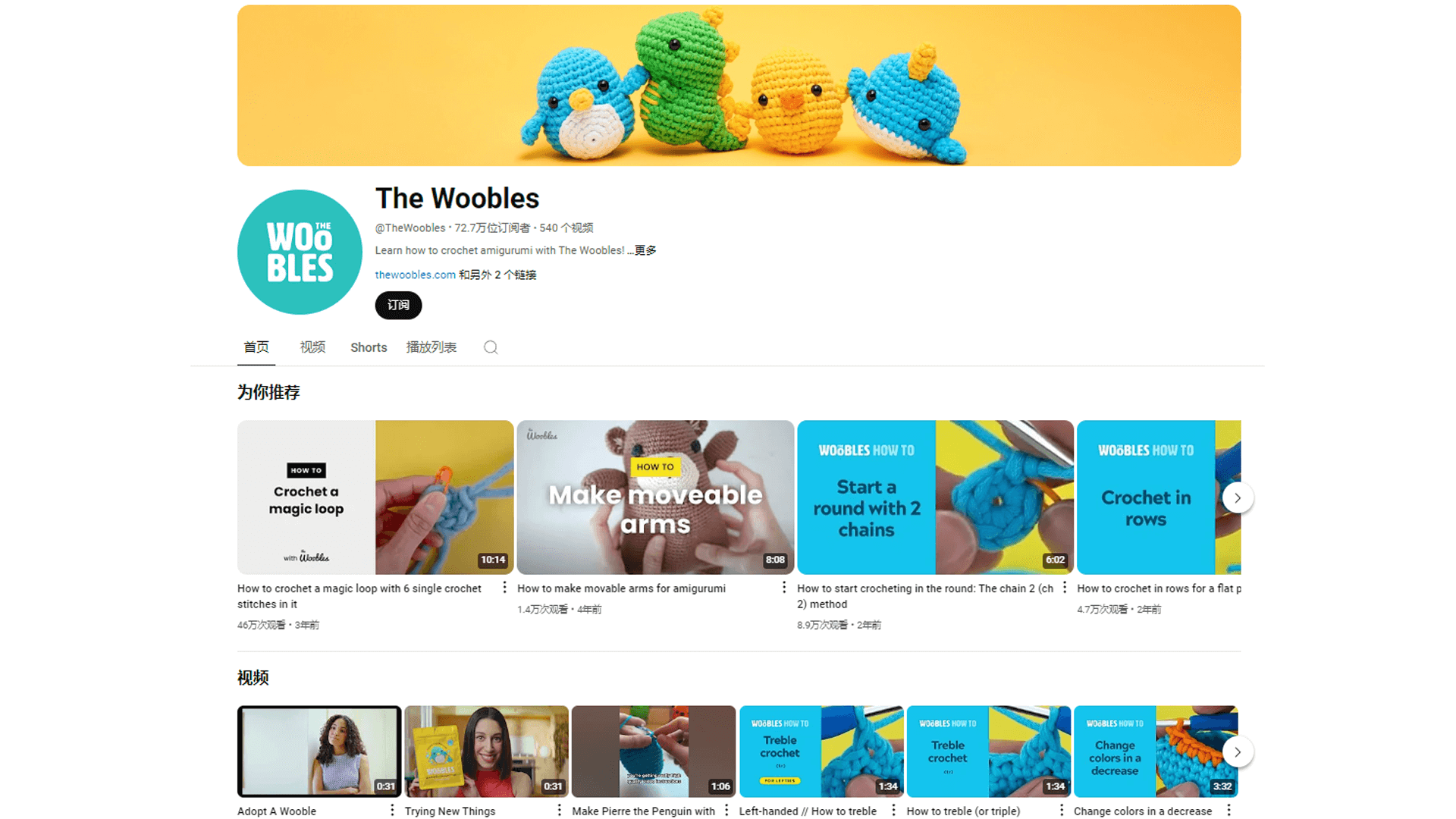 在YouTube上,The Woobles早在2020年就已经开始发布视频,至今The Woobles 在 YouTube上收获有72万的订阅,在发布的内容上大部分是毛线编织干货和简单的小剧情来将产品巧妙地插入其中,产品有趣可爱的形象不会有任何违和感。