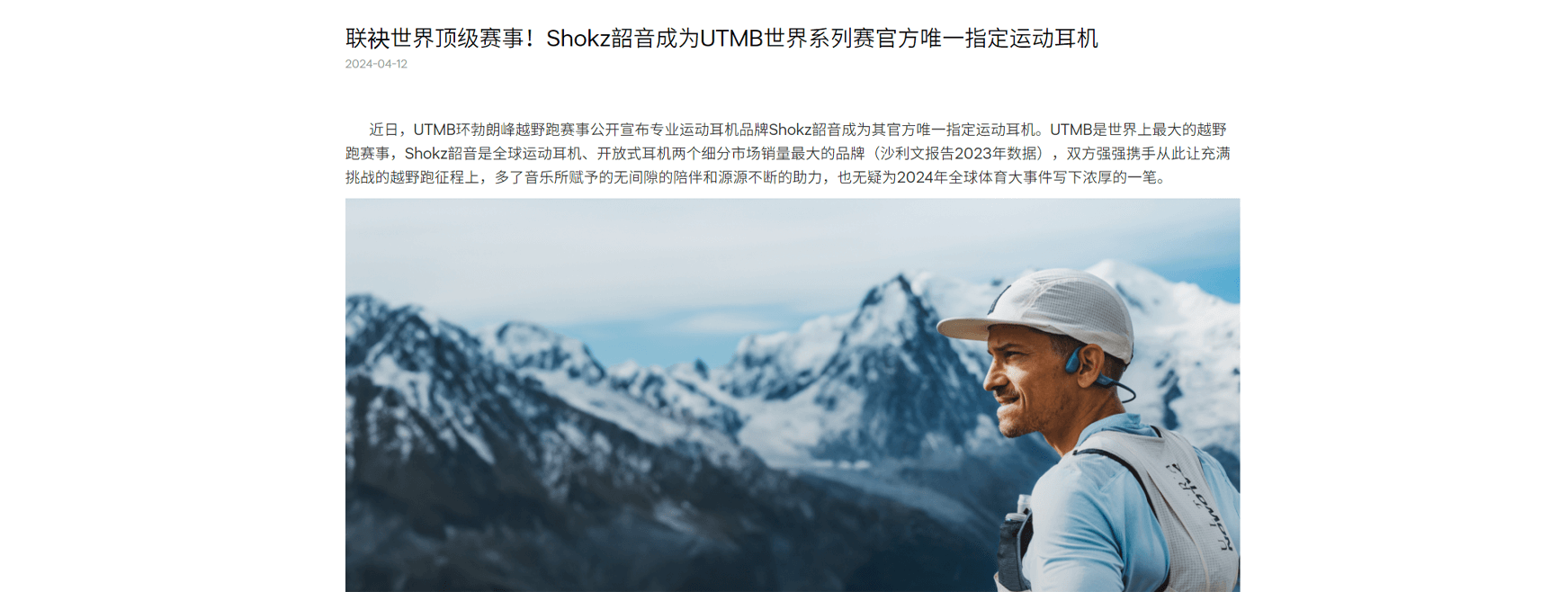 骨传导耳机本就是一个专注运动领域的电子消费产品,且跑步恰恰就是其核心的应用场景。因此Shokz韶音不会放过跑步顶级赛事的热度和大量爱好者聚集的绝佳时机,Shokz韶音通过赞助跑步顶级赛事为品牌带来扩大知名度,有效地提升品牌在跑圈里传播。