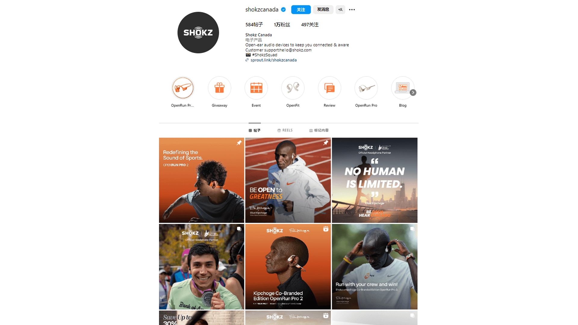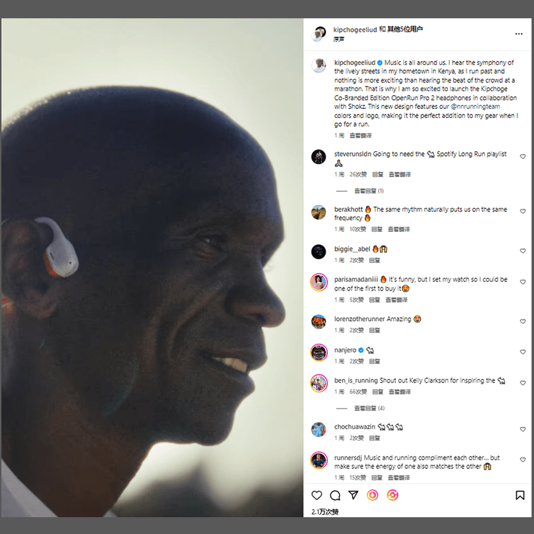 在埃鲁德·基普乔格的个人社媒账号上,我们能看到他与Shokz韶音联合发布的合作帖文,内容方面表示了他对Shokz耳机安全性和可靠性的认可,因此愿意成为品牌的全球大使,这样的红人营销策略更加巩固了Shokz韶音的专业运动耳机形象。