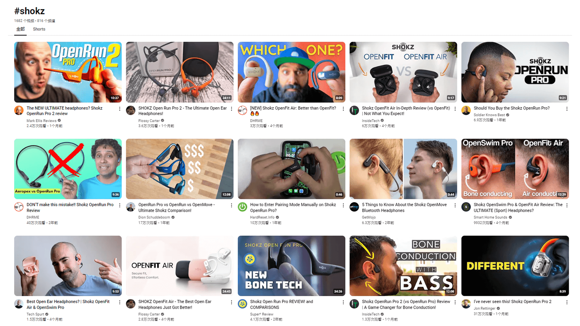 除了与运动垂类顶级红人合作以外,Shokz韶音也与科技类多场景的红人进行合作,仅仅在YouTube上,最近1年就有超过千条关于Shokz的达人种草视频,比如科技与数码3C类红人的产品测评视频以及在行业内的专业性和话语权持续引爆话题,累计曝光人数,通过耳机开箱、使用测评等方式,覆盖更多垂直领域下的不同粉丝群体。