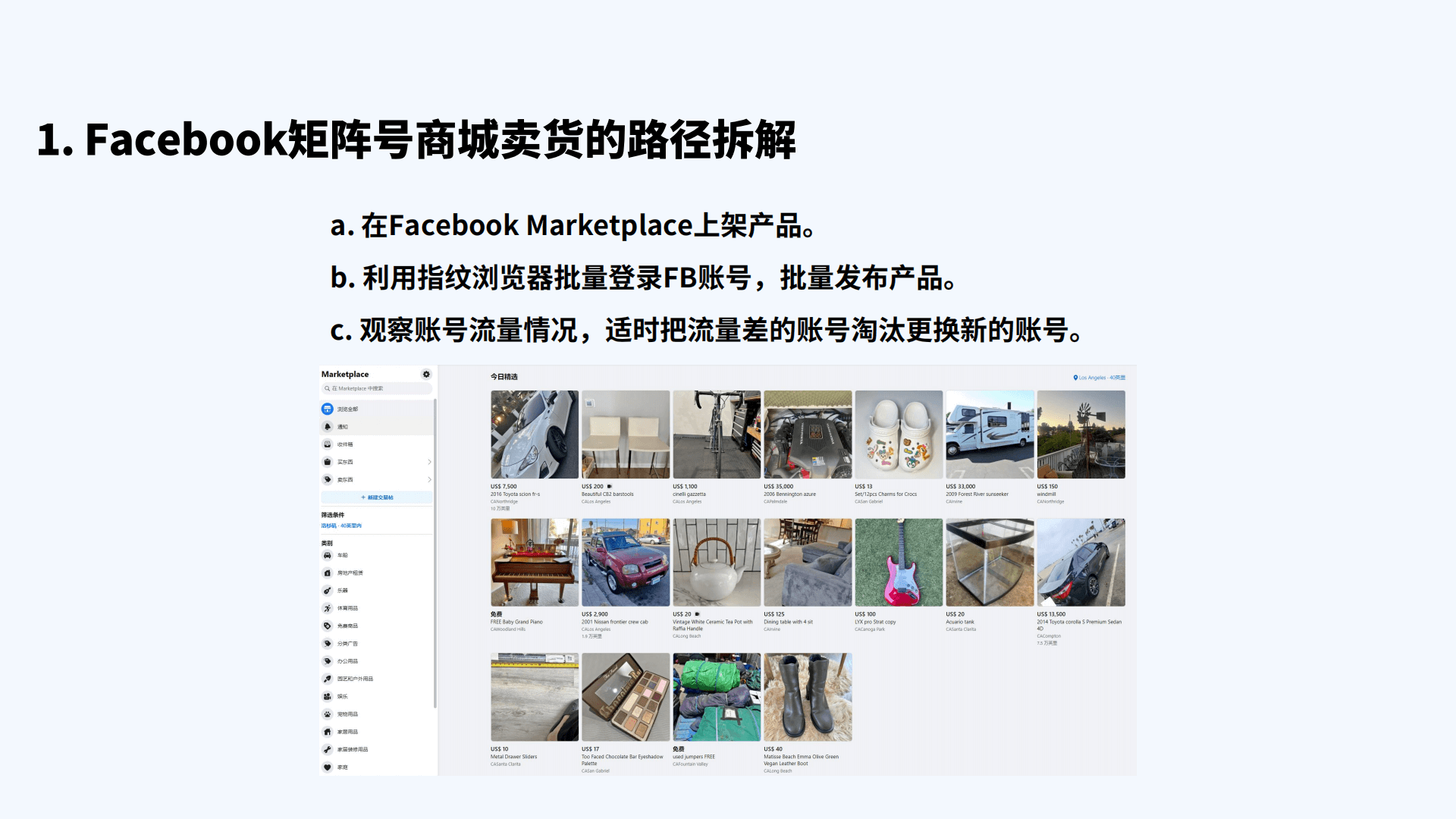 我今天分享的是比较简单粗暴,而且上手门槛比较低的项目,非常适合这里的产品是比较高客单价的非标品。非标品不解释了,大家都懂,就是价格可以随你自己定,但不太离谱。这个玩法是基于Facebook平台。