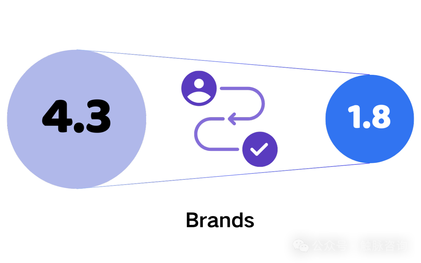 研究数据表明,消费者在购买周期的初期通常会考虑多达4.3个品牌,但在最终决策阶段仅剩下1.8个品牌。这意味着,企业不仅需要在早期接触阶段赢得消费者的关注,更要在消费者做出最终选择之前保持高度的相关性,以确保自己在最后的品牌名单中占有一席之地。
