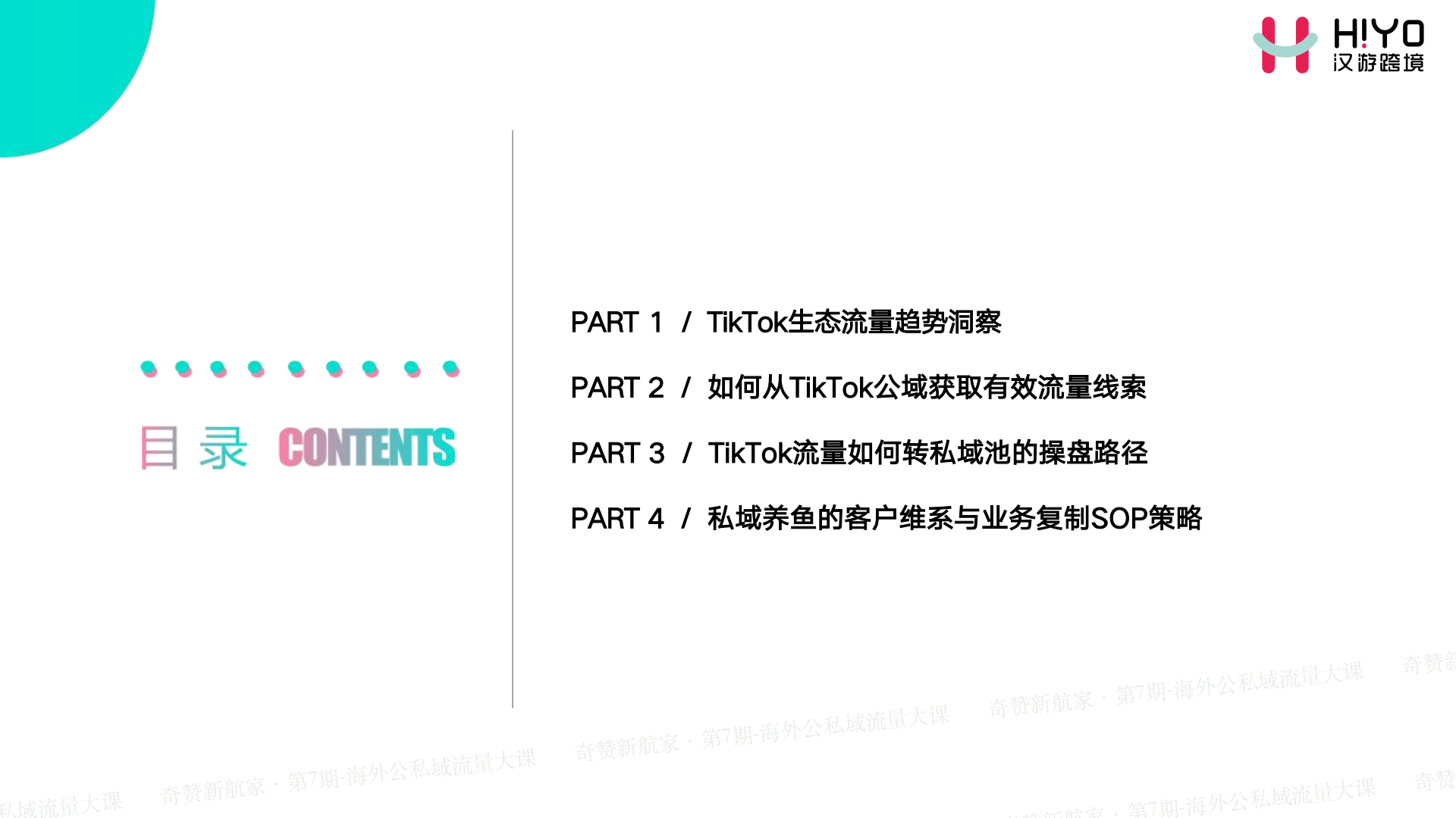 今天我讲四个主题。第一个主题是目前TikTok的生态流量处在什么阶段。第二个是公域流量怎么获取,第三个是获取完之后,我们如何转化到私域。第四个板块是私域的客户来了之后,我们如何去做承接,如何培养或者复制我们的团队服务更多其他的工厂或者类目。