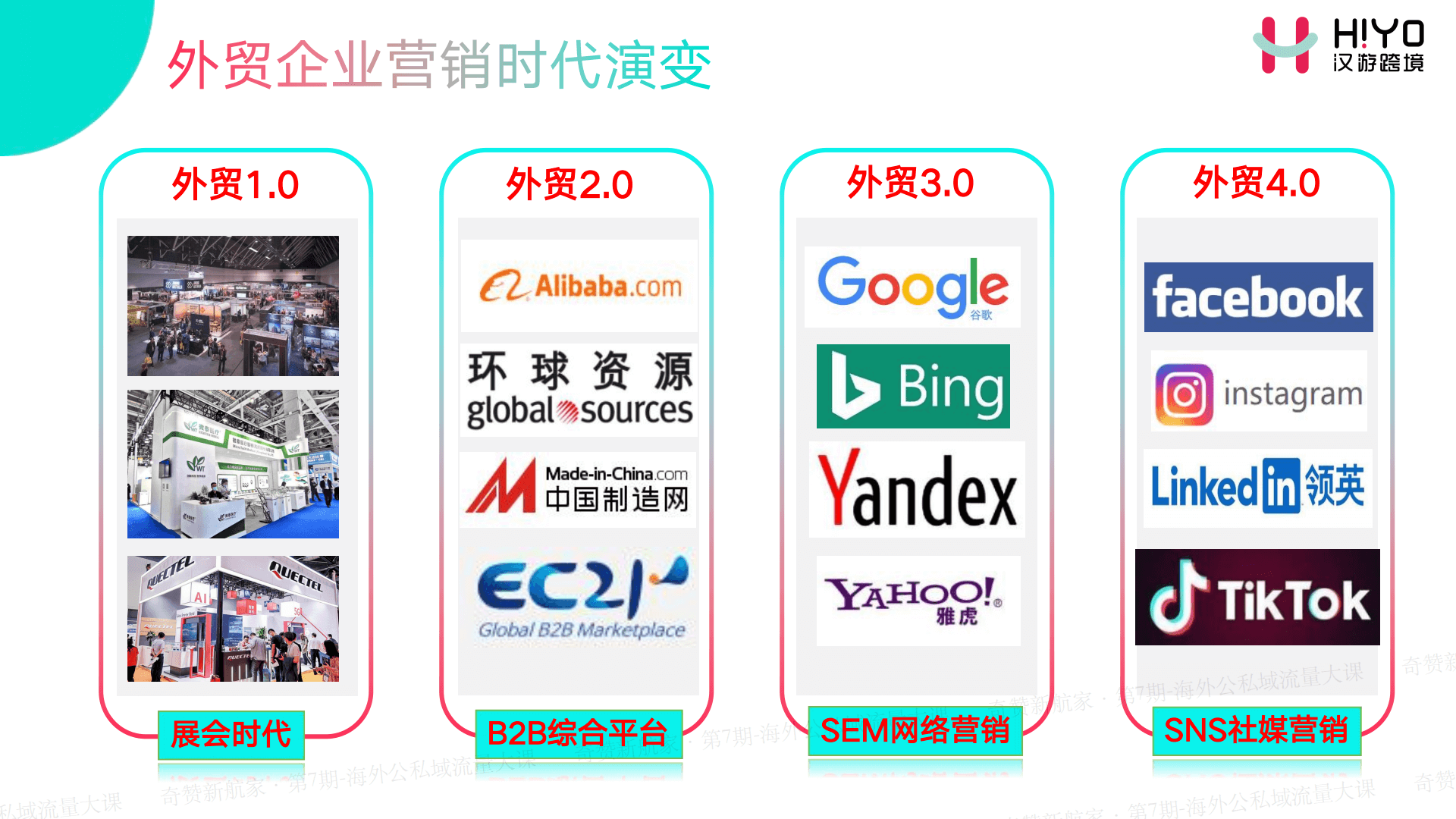 在关于外贸这一块,我个人的见解是经历了四个阶段。第一个阶段是传统的展会形式,包括最近一段时间广交会正在开。第二种外贸是B2B综合平台,比如阿里巴巴、中国制造网。第三种是SEO、SEM的网络营销。第四种是全域社媒营销,比如Youtube、TikTok、Facebook、Instagram,这一类是我们正在做的全域社媒营销。