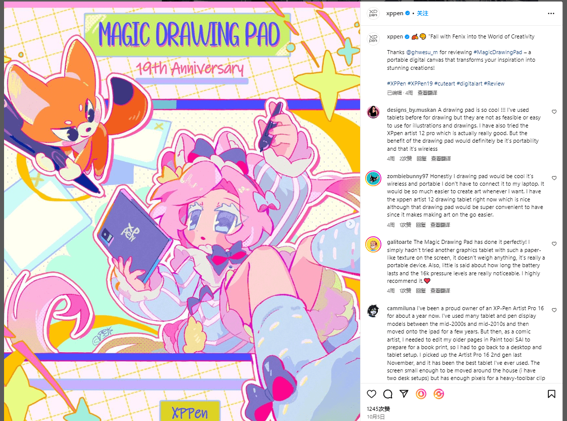 在XPPen的社交媒体账号上,可以看到品牌与来自不同地域、不同网红画师的合作帖子,通过XPPen佣金合作的方式邀约画师作画,利用画师自带的粉丝流量进行引流拉新。