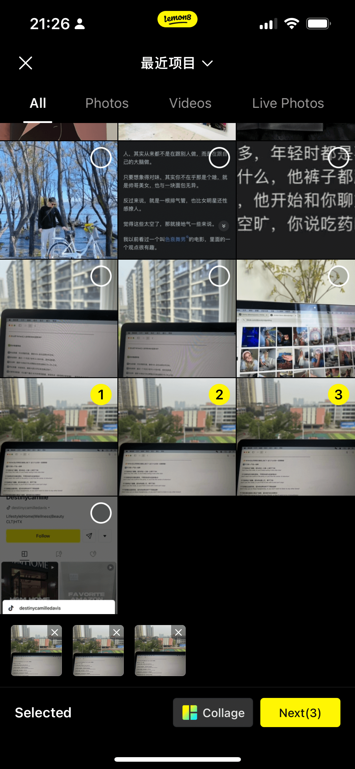 通过点击首页中间的“➕”号按钮,我们就能进入到Lemon8的发布流程。平台官方鼓励用户每次发布3-7张图片,但具体还是依据实际情况来定。