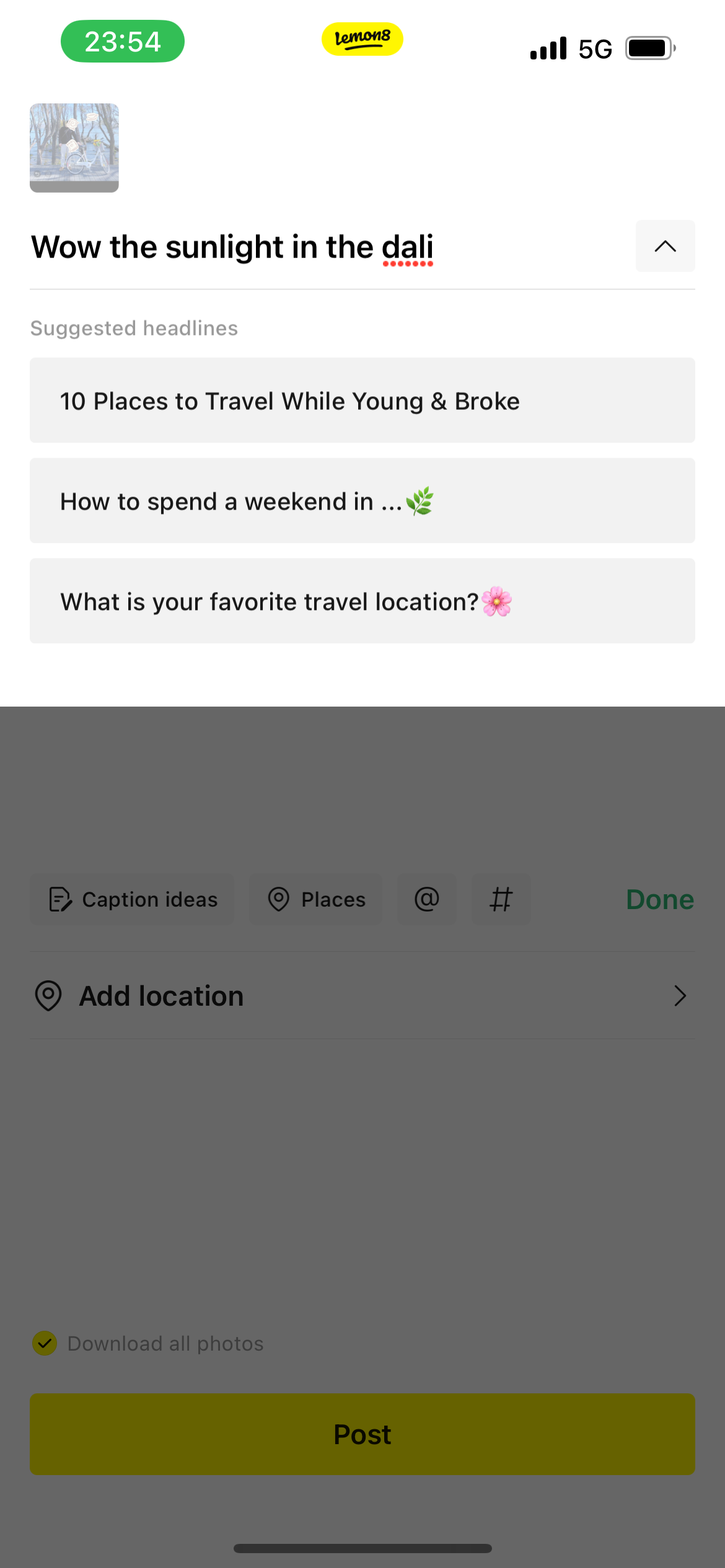 当用户编辑好图片后,就会来到发布的最后一个环节。Lemon8在这里为用户提供了标题优化和实时预览这两个功能。