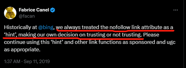 而有意思的是,Bing倒是一直以来都把Nofollow当作“提示”,而非“指令”。