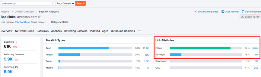 例如Semrush的Backlink Analytics功能,就可以看到目标网站的外链中,Dofollow与Nofollow链接的各自数量。