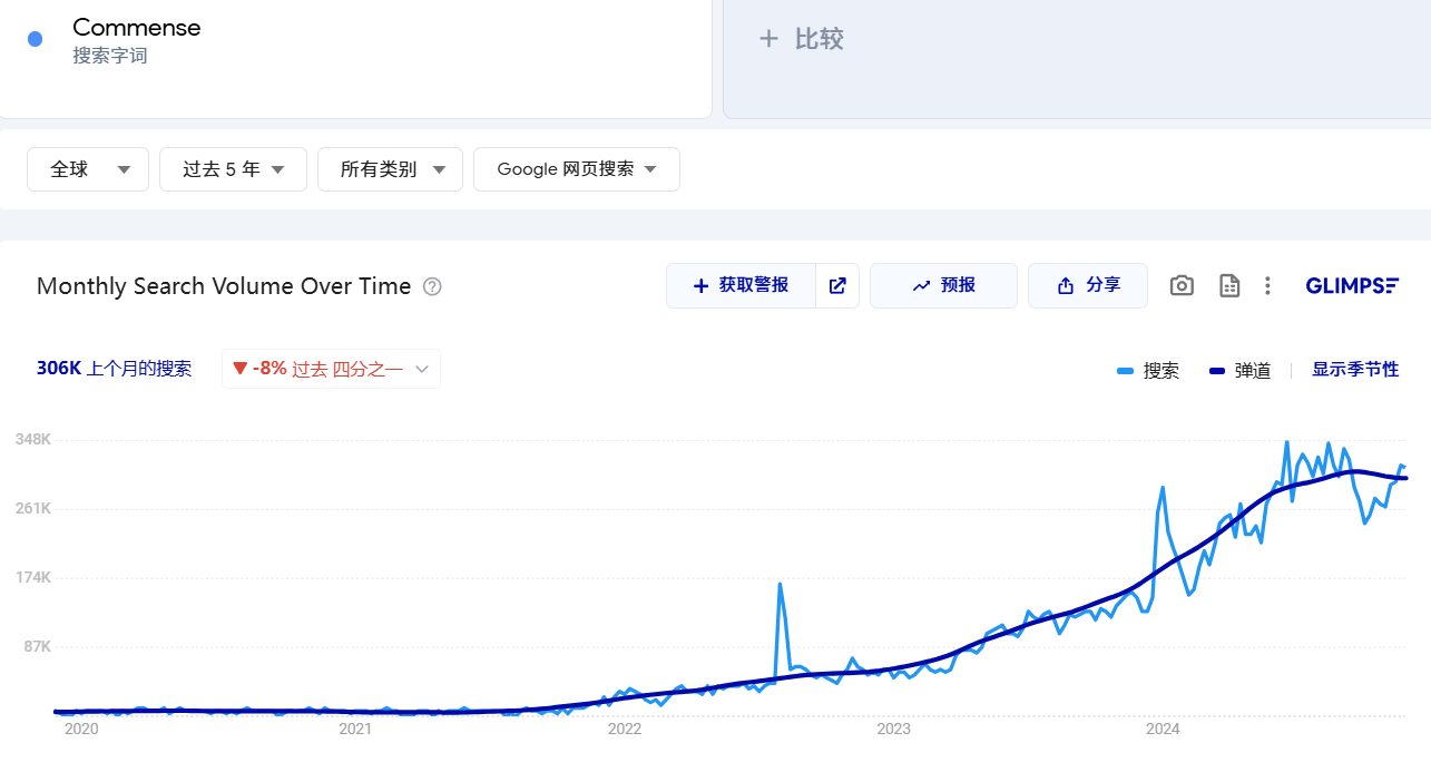 依据Google trends(谷歌趋势)的数据显示,经过三年的运营,品牌词“Commense”的搜索热度出现了显著的增长。这一现象表明,公众对该品牌的兴趣和关注度正在持续提升,这无疑为品牌的发展传递出非常积极的信号。