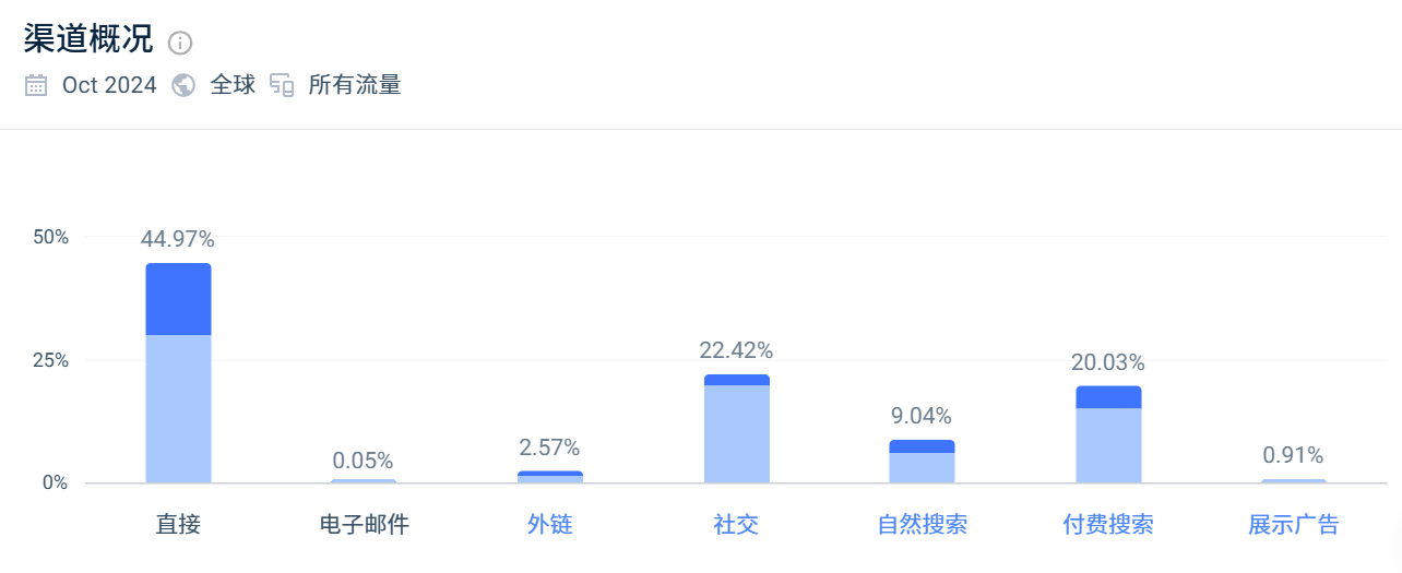在独立站流量渠道来源中,直接访问、社交流量及付费搜索是当前主要的流量来源,分别占比44.97%、22.42%%和20.03%。