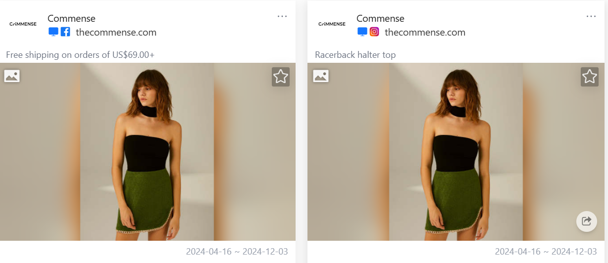 Commense将Meta平台作为引流的重点渠道,目前正在投放的素材数量多达1200条。在这些广告投放素材当中,图片占据了主导地位,其占比约为七成。并且,Commense重点针对美国和加拿大地区进行投放。