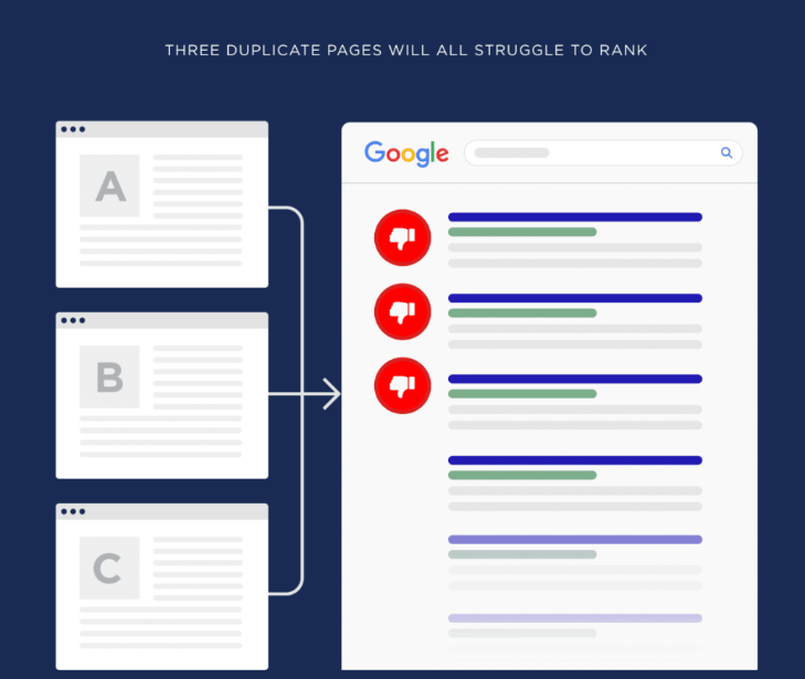 那么谷歌在去抓取你这三个页面的时候,可能很难确定哪个页面最为相关。这可能导致权重和链接信誉(即SEO的“juice”)在多个重复页面之间分散,从而使得任何单一页面的排名都不如独一无二的内容页面。并且这些页面即使被收录了,相互之间也会有内部竞争。