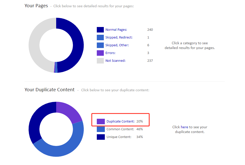 这里我们需要借助Siteliner这个工具来爬取我们的网站,在爬取结果中,可以帮我们直接分析出站内那些文本内容重复度较高。但是合理要注意了,你在修改的时候需要看一下内容的前后文,如果说是一些专业的名词的重复,不需要修改。不要修改后导致内容的阅读体验变差了,这样就得不偿失了。一切工具都是辅助,不能百分之百的相信工具。