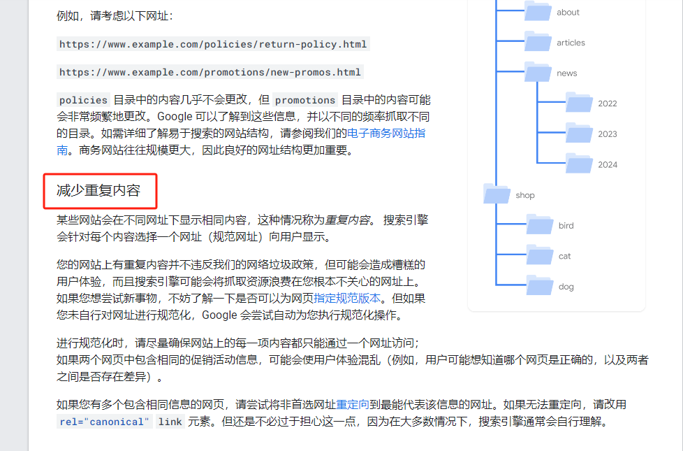 - 动态URL引起的重复:例如,同一内容通过不同的URL访问(如“产品”页面通过?id=123和/product123访问),这可能会被视为重复内容。