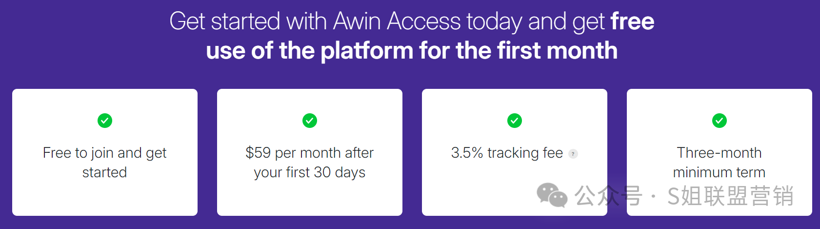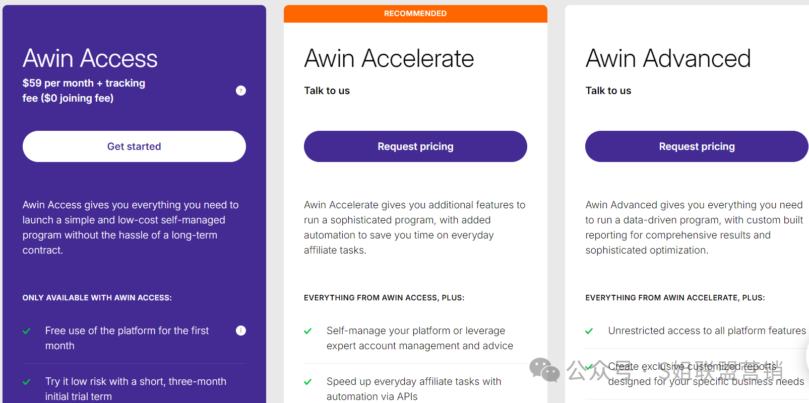 Awin Access: 比较适合中小型商家,0-1阶段刚尝试联盟营销的品牌卖家,无开户和技术对接费用,最低3个月起用,每月59美金是接近免费试用Awin平台,前30天是可以免去59美金的费用,销售额基础上3.5%的订单费用,不合适可以很快终止合作,试错成本低。
