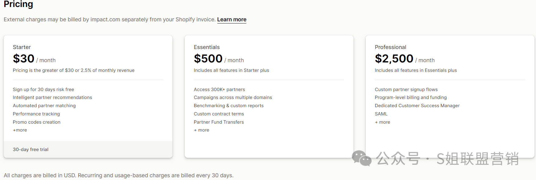 然而,在商家体量巨大,特别是联盟营销占比很重时,PartnerBoost和Impact的费用差距就越来越小了,综合考虑性价比的情况下,impact会更得商家青睐,毕竟影响力,服务力度方面是有目共睹的,特别是可以谈下来前2个月免月费和订单抽成,更惊喜的是500美金月费,是不经意在官方博客看到的,详情原文链接:https://apps.shopify.com/impact-1?search_id=af1804a0-adcf-480a-99a6-aa3e3daf8f91
