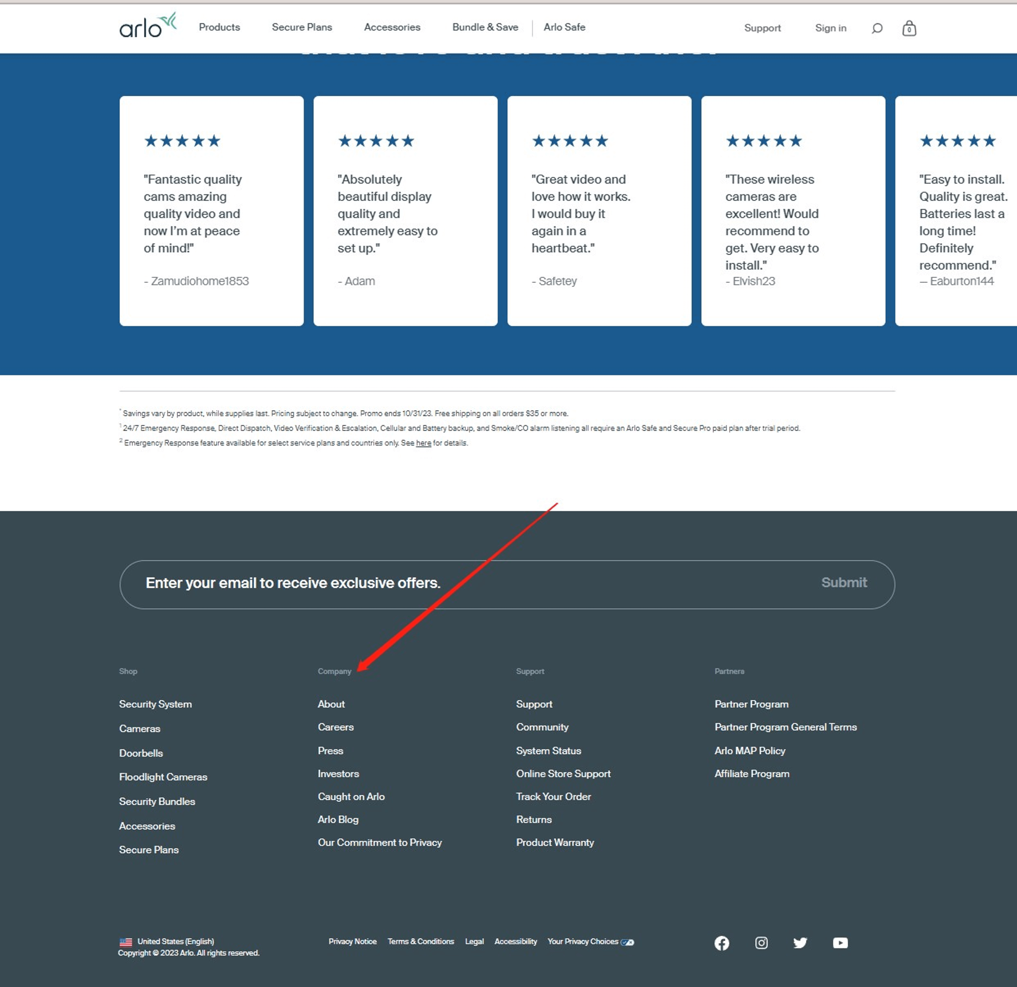 很多出海品牌有一个共同的特征,就是在有意无意地隐藏自己的身份。我们来看美国家用安防摄像头巨头Arlo的官网中的关于公司的一些板块,可以看到其涵盖了公司人力(招聘)、媒体乃至投资者关系的信息。