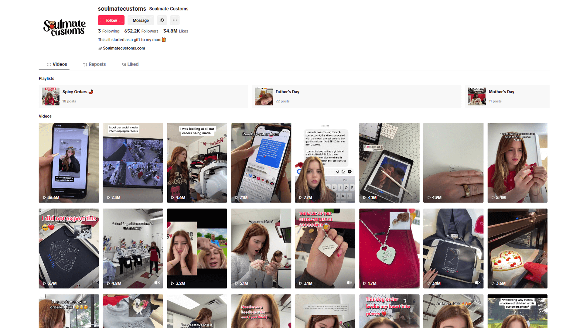 客户的定制订单不仅是产品本身,更成为其品牌账号的重要来源。通过展示客户的真实订单,Soulmate Customs成功实现了营销与产品的无缝融合,将客户珍贵记忆转化为定制产品,以情感价值打动消费者,形成深度品牌连接,既增强了真实性,又提升了用户的参与感。