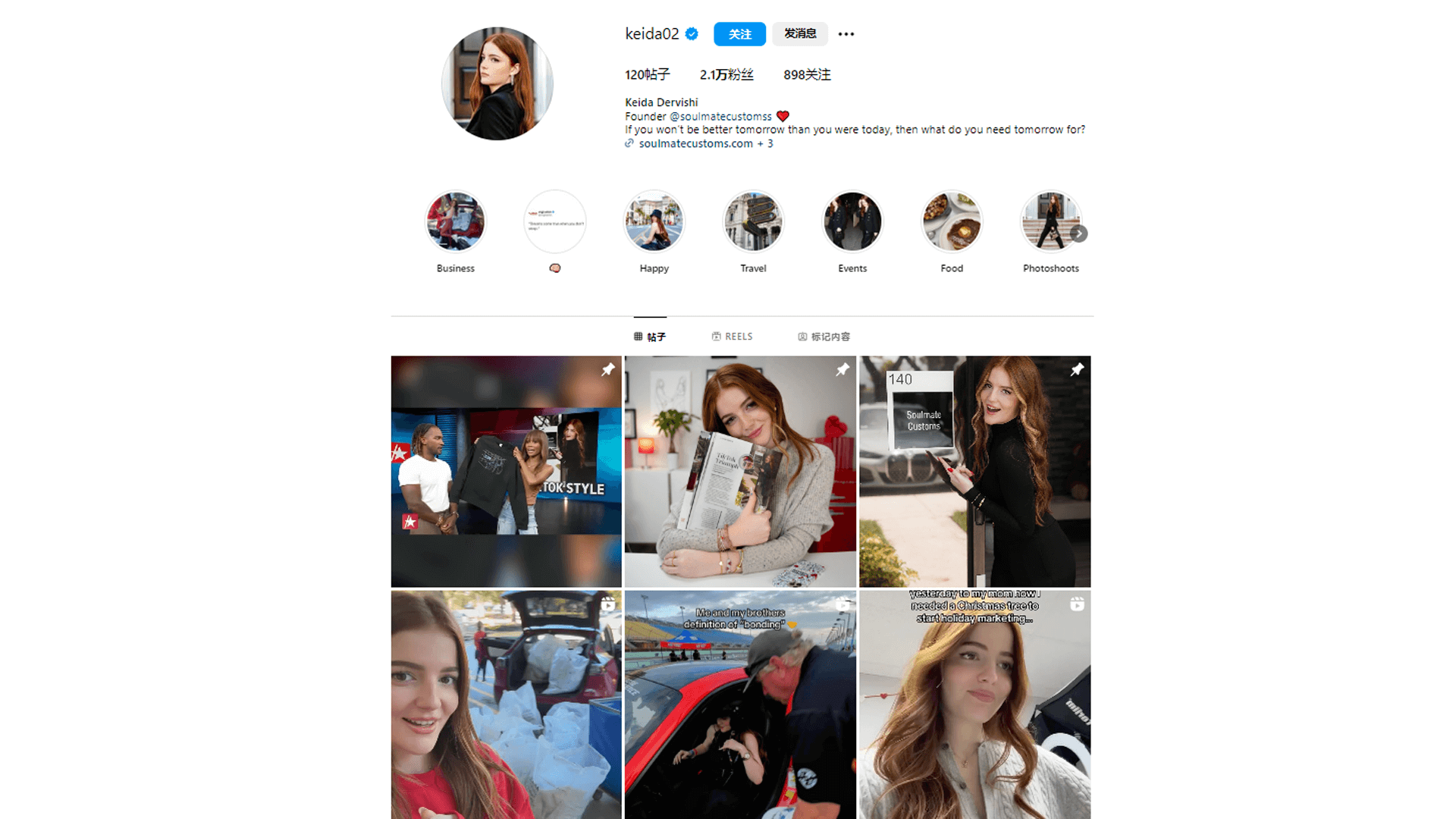在Instagram的品牌账号简介中,Keida Dervishi还@出了自己的个人IP账号,通过分享自己的创业故事与各种节目中访谈内容来增加品牌影响力,让其客户通过个人经历感受到品牌温度。