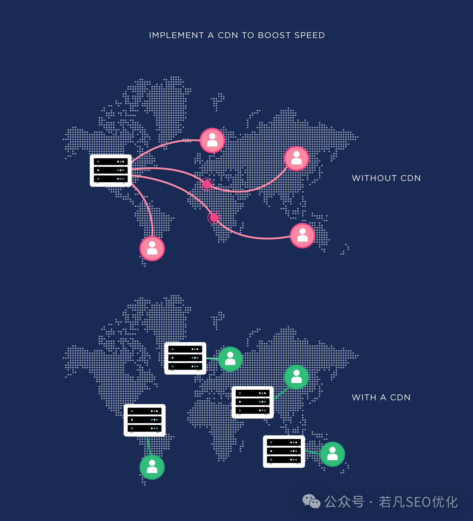 CDN通过确定你的访问者的物理位置……然后从一个离他们更近的服务器提供你网站的资源来工作,。