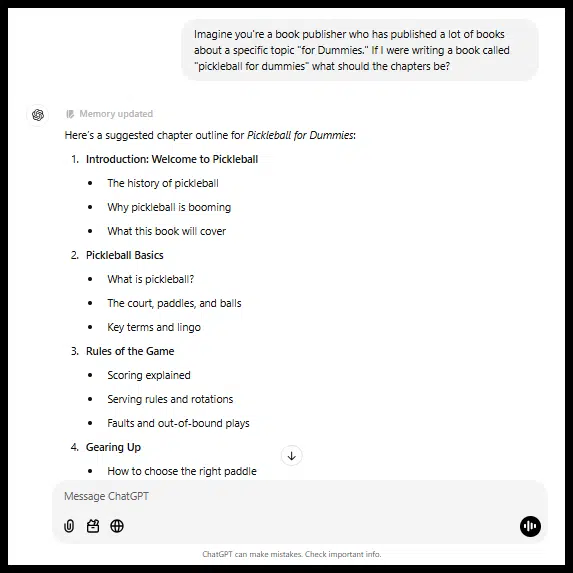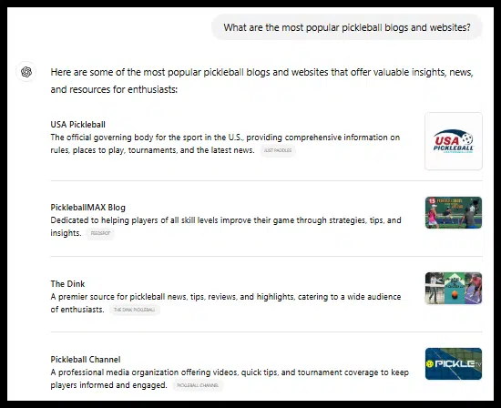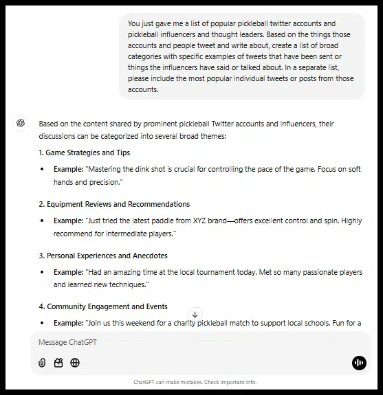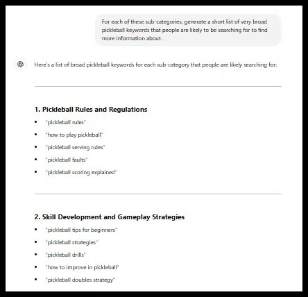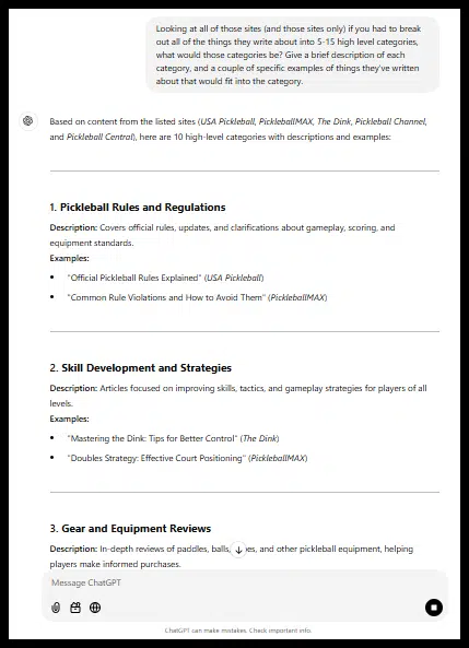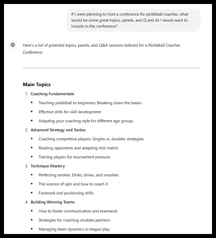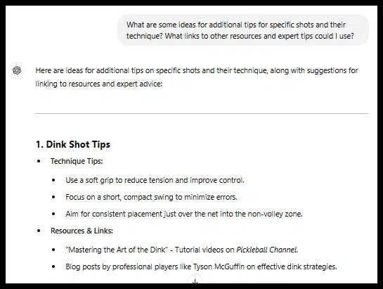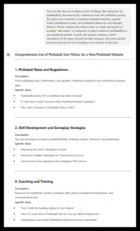 假设我要做一个关于“匹克球(pickleball)”的网站,并希望获得一些内容创作思路。我可以尝试以下提示词,获取一些初步的内容创作思路: