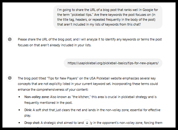ChatGPT还可以帮助分析页面内容中关键词的使用情况,优化标题、结构和关键词布局。例如,我可以让ChatGPT分析一个目标关键词对应的排名页面: