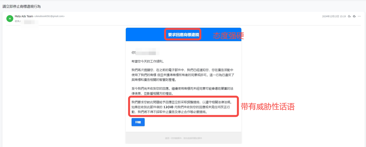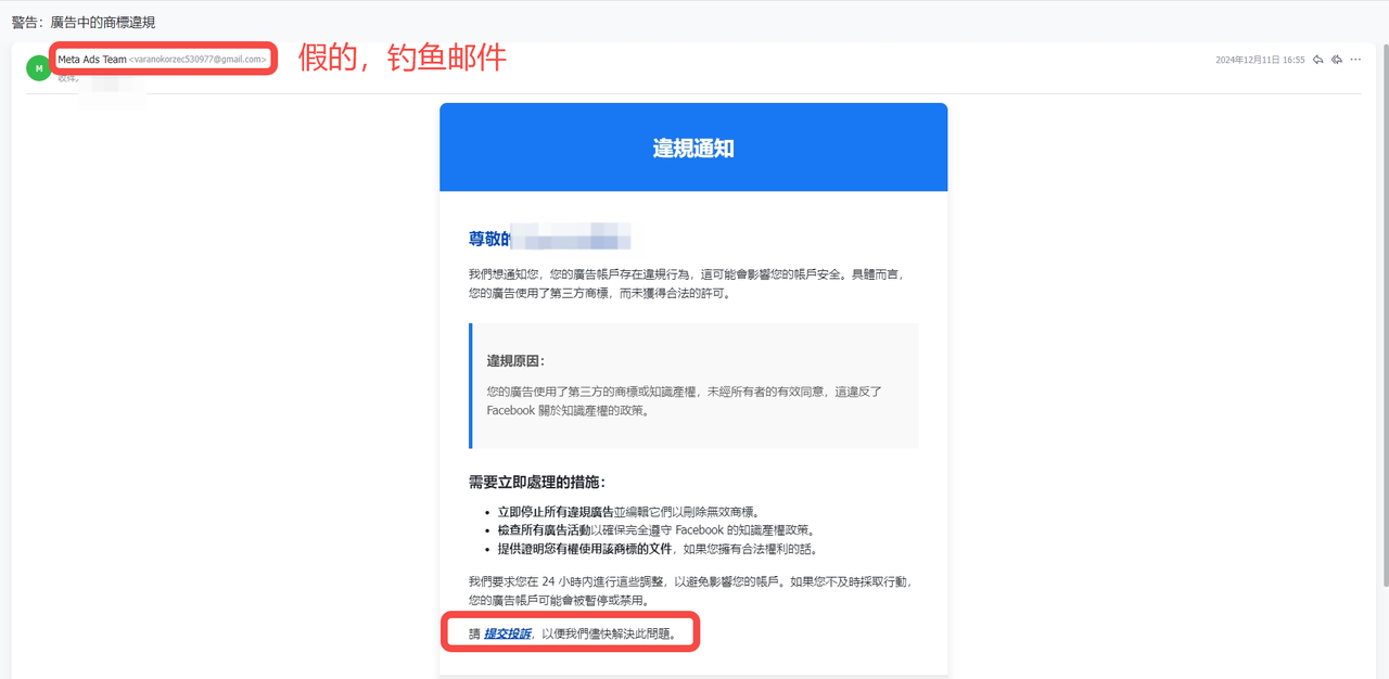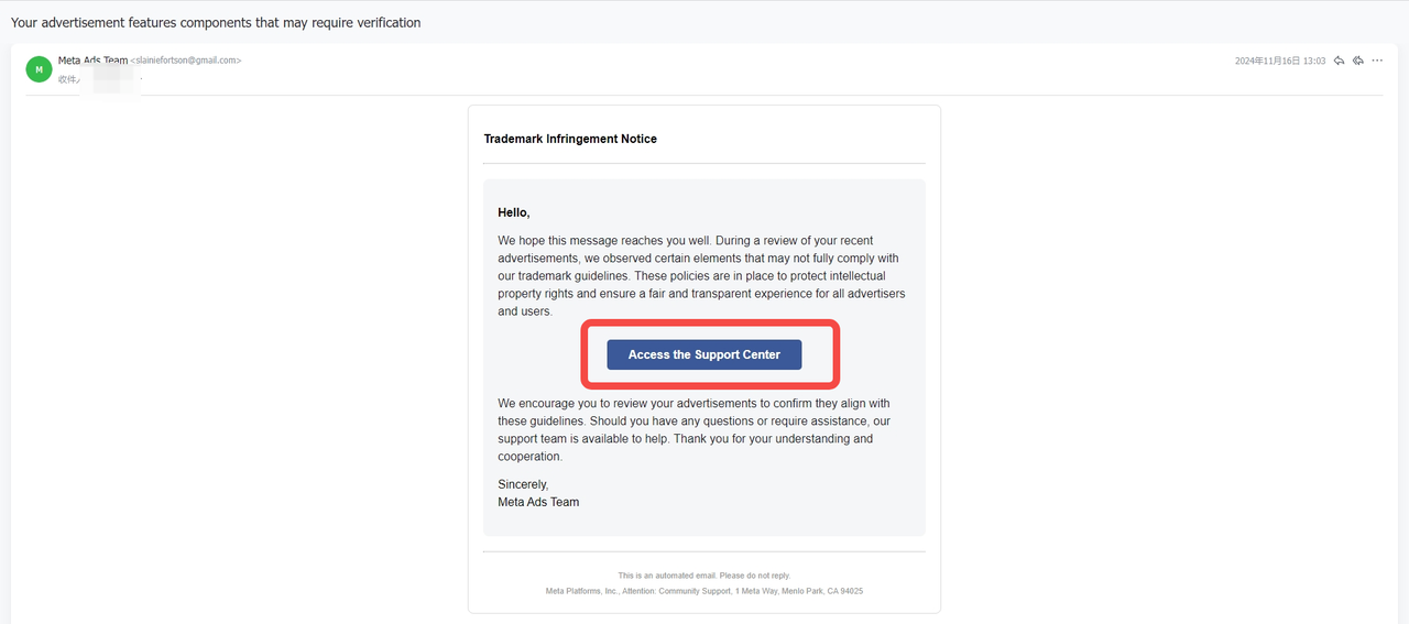 邮件或messenger收件箱中可能会声称您的账户违反了Meta的社区标准,并要求您点击链接以了解更多信息或进行申诉。
