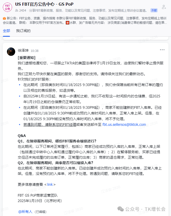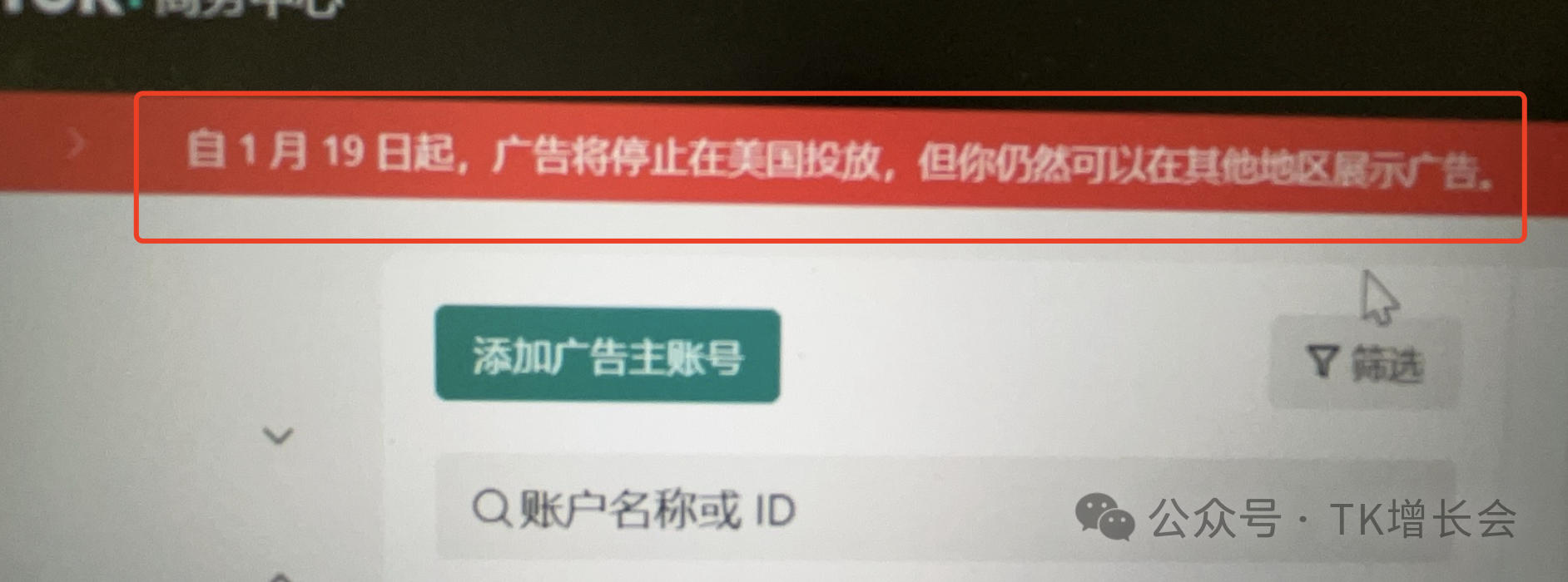 TikTok Shop电商和TikTok For Business广告部门,分别发出站内消息,提示商家1月19日将暂停美国市场的服务。